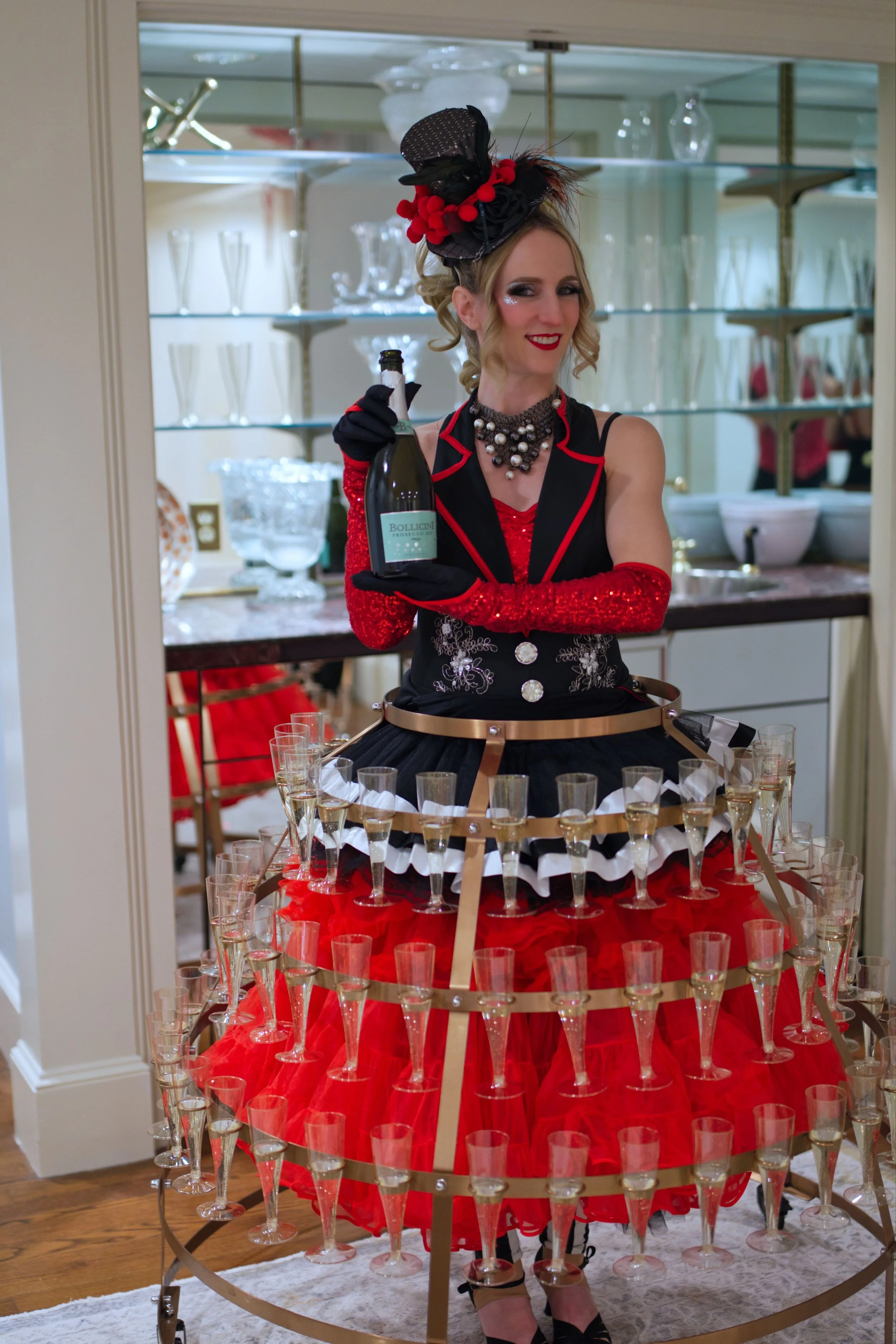 The Champagne Skirt transforms beverage service into performance art. Perfect for cocktail hours, gallery openings, gala receptions, and intimate soirées, this roving entertainer brings an unmistakable sense of occasion to every corner of your venue — no bar queue, no trays, just pure theatrical charm.